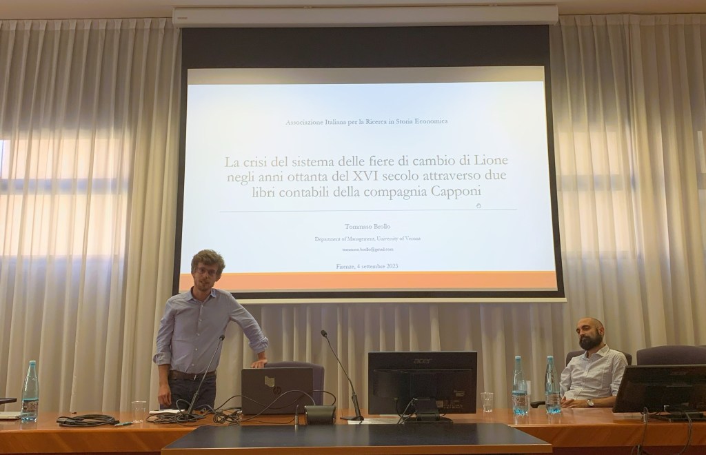 L’incontro è proseguito con la presentazione dei borsisti ARiSE, che hanno affrontato interessanti argomenti di ricerca. Sonia Schifano ha esaminato il tema della distribuzione della ricchezza in Sicilia dal XVI al XVIII secolo. Gianni Marciante ha esplorato la correlazione tra istruzione e fertilità in Italia tra l’8 e il 900. Tommaso Brollo ha analizzato la crisi della fiera dei cambi di Lione attraverso i libri contabili della famiglia Capponi nel XVI secolo. Infine, Fabrizio Ansani ha esaminato l’economia di guerra nel Quattrocento, concentrandosi su aspetti tecnici e commerciali delle merci strategiche.