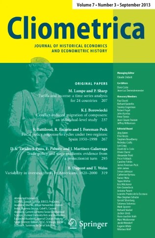 E’ stato pubblicato il nuovo numero della rivista Cliometrica, Journal of Historical Economics and Econometric History con i seguenti articoli: Path dependence in an evolving system: a modeling perspective di Thomas Brenner & Sonja zu Jeddeloh; Gender inequality in a transition economy: heights and sexual height dimorphism in Southwestern France, 1640–1850 di Leonardo Ridolfi; The urban–rural height gap: evidence from late nineteenth-century Catalonia di Ramon Ramon-Muñoz & Josep-Maria Ramon-Muñoz; Competitive devaluations in the 1930s: myth or reality? di Jonas Ljungberg; Measuring stock market integration during the Gold Standard di Rebecca Stuart; Bank risk and stockholding (1910−1934) di Matthew Jaremski; Benchmarking Latvia’s economy: a new estimate of gross domestic product in the 1930s di Zenonas Norkus, Jurgita Markevičiūtė, Ola Grytten, Jānis Šiliņš & Adomas Klimantas