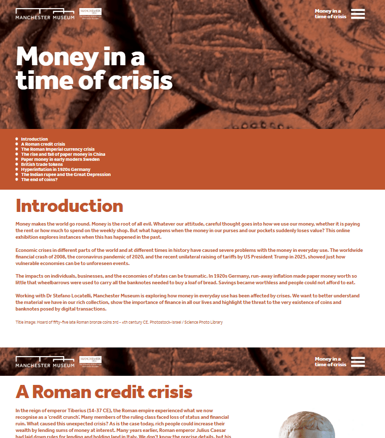 E’ disponibile in rete ‘Money in a time of crisis’, la mostra che ripercorre la storia della moneta dai tempi di Tiberio (14-37 d.C) all’attualità. La mostra è curata da Stefano Locatelli, attualmente Marie Curie Fellow presso il Dipartimento di Scienze e Politiche Ambientali dell’Università Statale di Milano, con la collaborazione di Bryan Sitch, Honorary Curator of Numismatics presso il Manchester Museum.